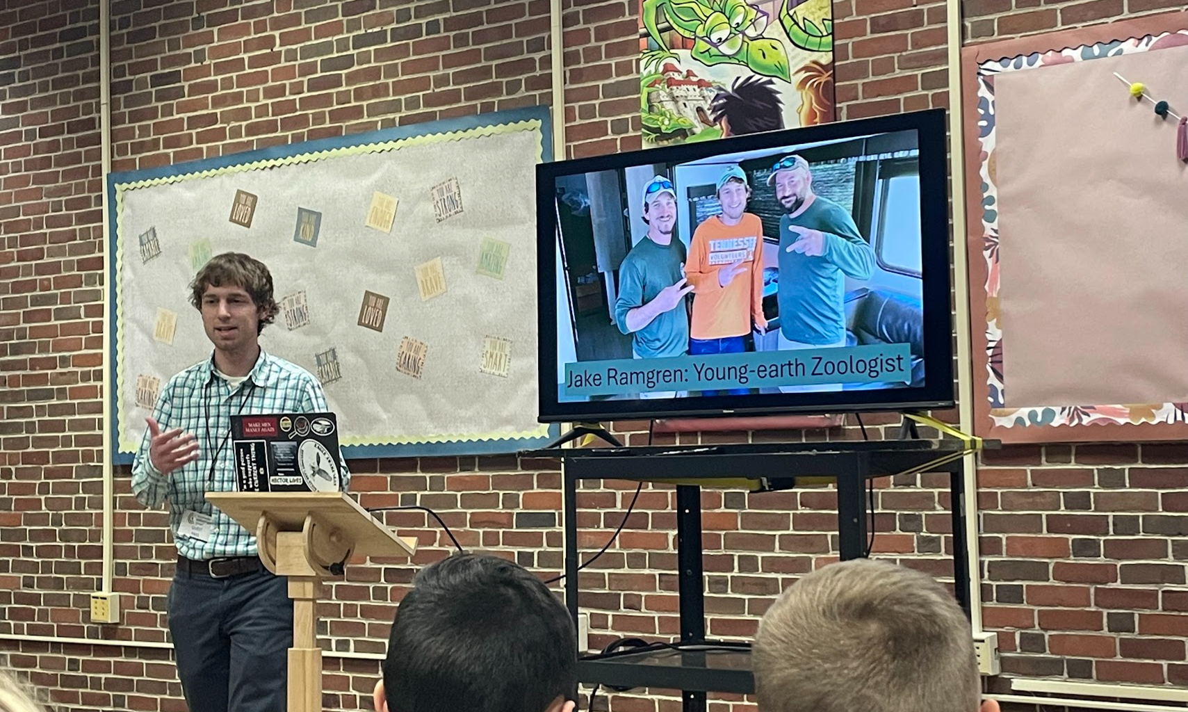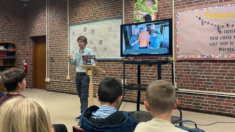 Jake Ramgren gives a creation seminar at a middle school chapel