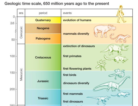 The Mesozoic and Cenozoic layers of the geologic column. In the theory of evolution, these are the "age of reptiles" and "age of mammals" respectively.