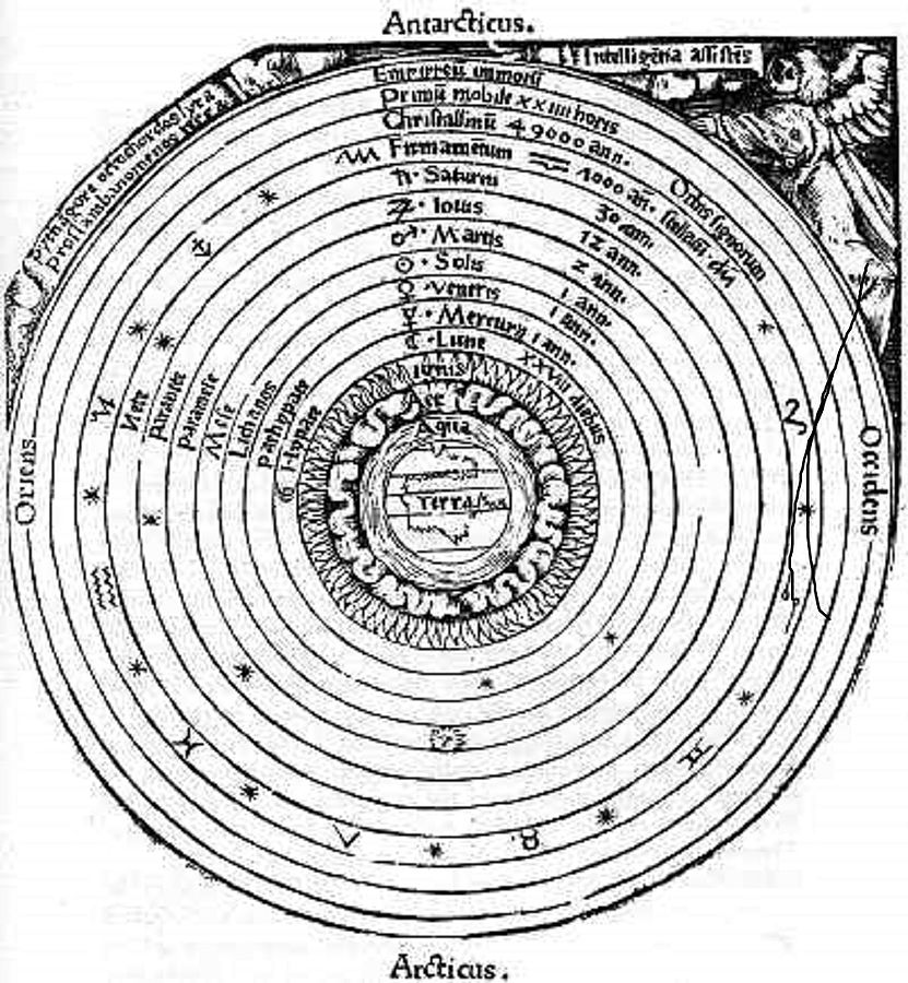 The geocentric model of the solar system as constructed by Aristotle. It was the dominant astronomical view for over a thousand years.
