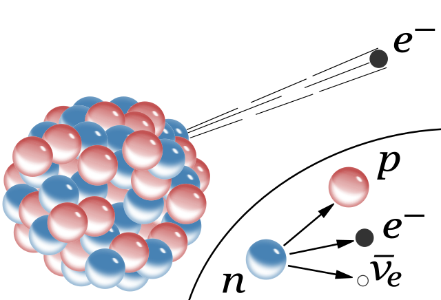 A simple visualization of beta-decay. The parent isotope (n) emits a beta particle (an electron) and a proton (P) and something called an electron neutrino (νe or antiparticle).