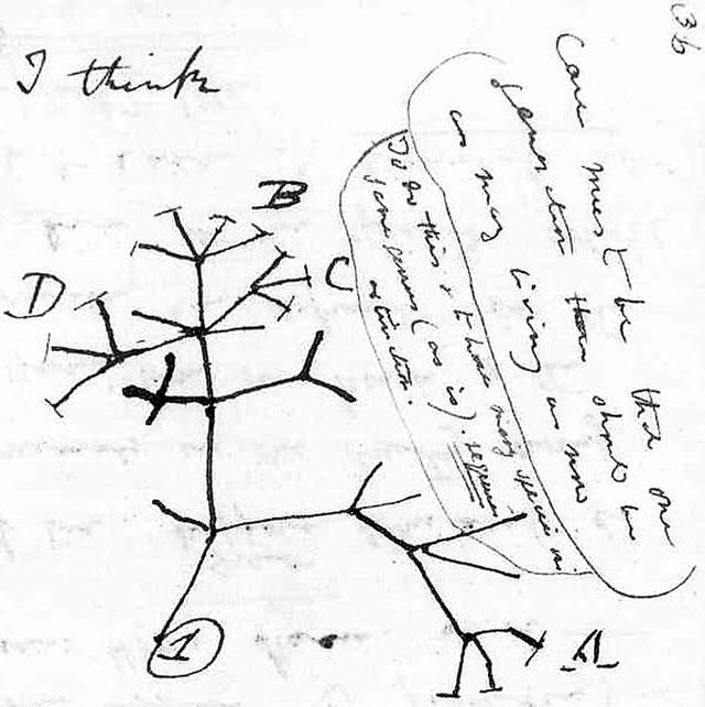 Charles Darwin's original sketch of an evolutionary tree, with the words "I think" famously scribbled above it