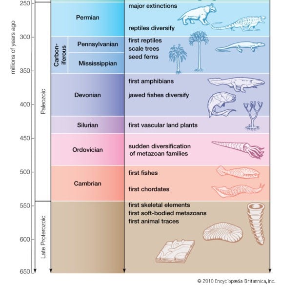 The Precambrian and Paleozoic layers of the geologic record, conventionally believed to be the oldest layers. The ages are given on the left.