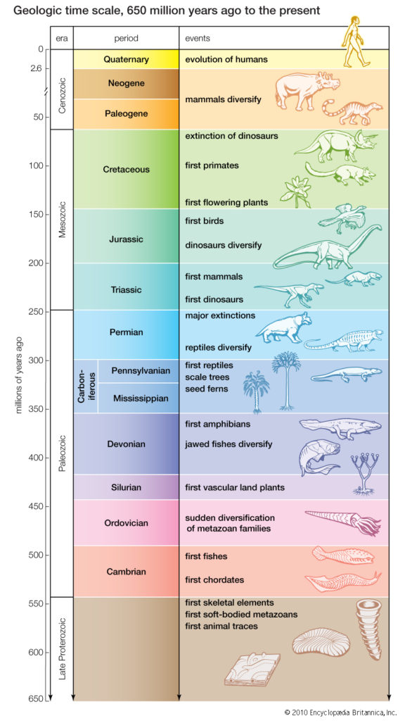 Each rock layer gets a name and a place on the vertical column. Most of the important major strata containing multicellular life fall into the Phanerozoic Eon, which is sorted into three major eras: the Paleozoic, the Mesozoic, and the Cenozoic (see diagram above). Each of these time periods is an interpretation of rock layers with the same name. Precambrian rock is the lowest rock down, and contains mostly microscopic fossils. But once we get to the Paleozoic, there is suddenly an explosion of fossils, including plants, invertebrates, fish, and even the first chordates (animals with a notochord). This marks a major event in the fossil record: the "Cambrian Explosion" (the first subdivision of the Paleozoic is the Cambrian period). As we move up the record, larger invertebrates appear, bigger fish show up, and eventually the first jawed fish and amphibians appear. This leads to the Mesozoic strata, which conventionally represents the time period known as the "Age of Reptiles" and contains only three layers: the Triassic, the Jurassic, and the Cretaceous. Dinosaur fossils are prevalent throughout these strata, but small mammals and birds appear as well. The end of the Mesozoic marks another major event: the end of the dinosaurs and the sudden appearance of large mammals. Finally, the Cenozoic (meaning "recent life") is divided into the Paleogene, the Neogene, and Quaternary layers. All three strata are full of mammals, with humans appearing at the very top of the Quaternary.