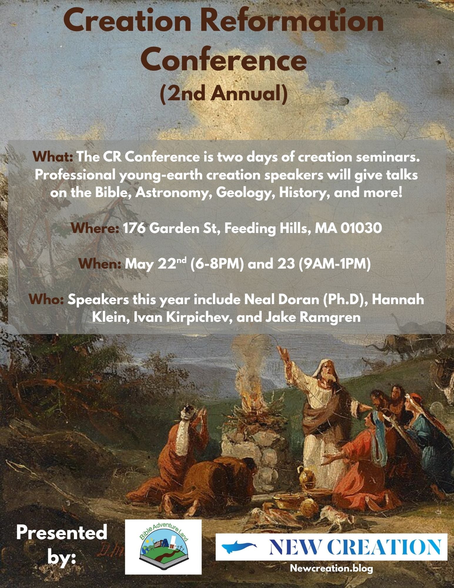 This year is the second annual CRC, and it will be hosted by Bible Adventure Land. The location will be 176 Garden St Feeding Hills MA 01030. The first day of the event will be Friday May 22, 2026 from 6pm-8pm, and the second day will be May 23 from 9am-1pm. For both days, plan on hanging around a bit if you want to meet the speakers!