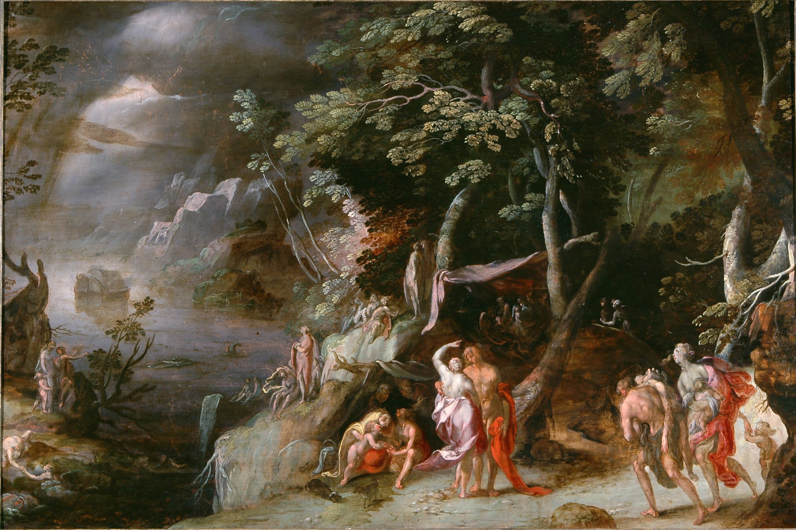 (Thomas Cole captures the peace of the receding floodwaters. Not exactly the most memorable moment in the Flood, but one that fits nicely the landscape style Thomas Cole was known for. Many of his paintings are majestic, but this one looks calm and peaceful to me. Even though there is a skull if you look close enough. Can you find it?)