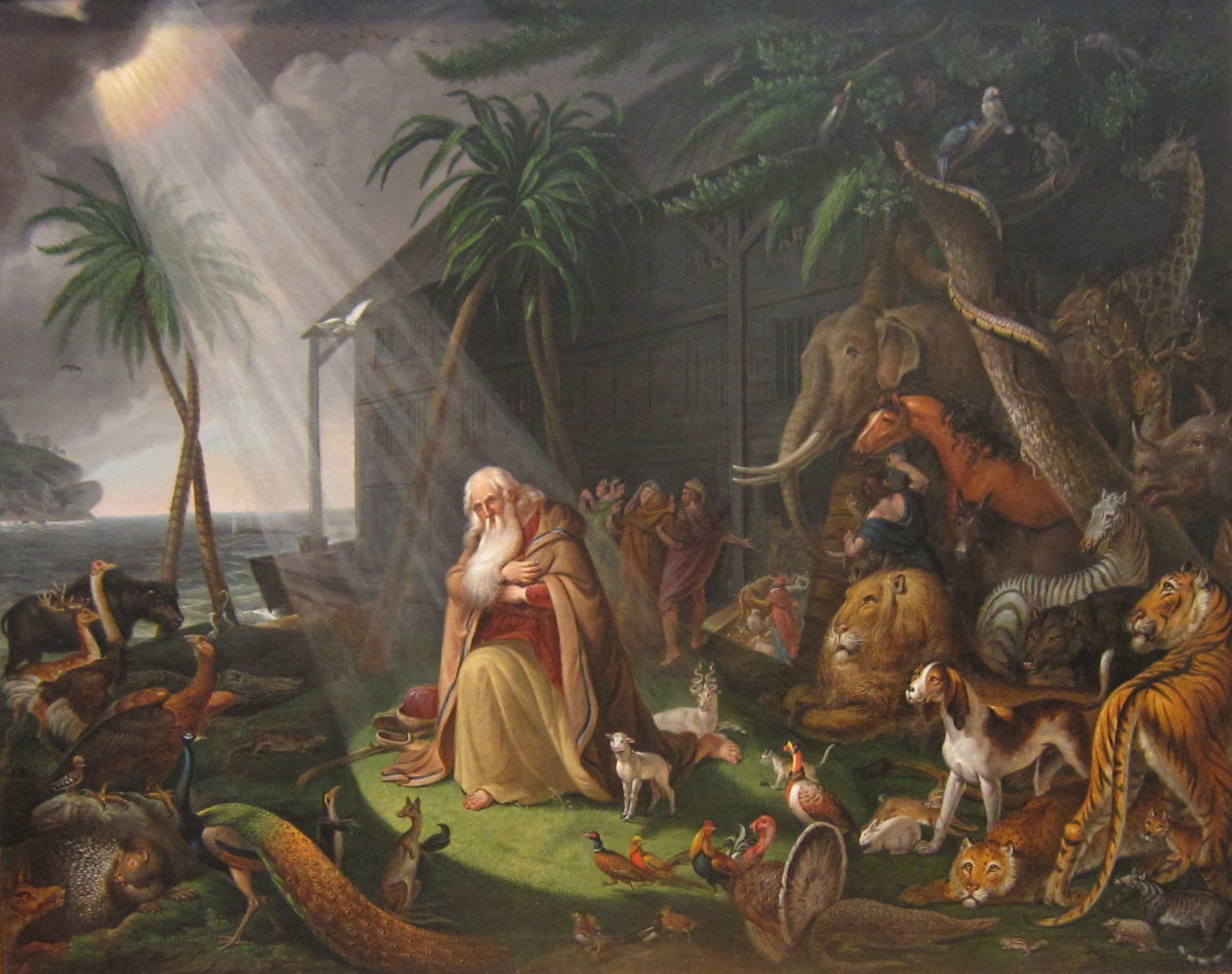 (Very few paintings show the animals leaving the ark, which I find strange. If I had such skill, I would much rather paint the celebration of survival and promise rather than the impending disaster as the animals enter the ark. I must say, I love the hat the man wears as he guides the cow down he ramp...)